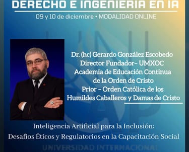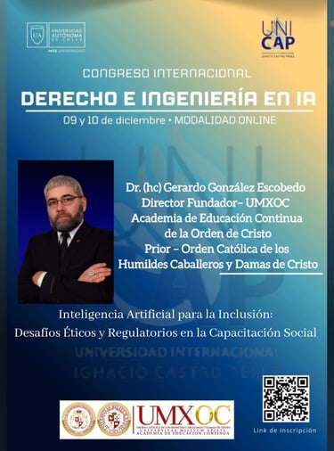 El día 10 de diciembre de 18:30 a 20 hrs (Hora Chile). Nuestro Director Dr. (hc) Gerardo González Escobedo, Presentará su ponencia: Inteligencia Artificial para la Inclusión: Desafíos Éticos y Regulatorios en la Capacitación Social No Formal.